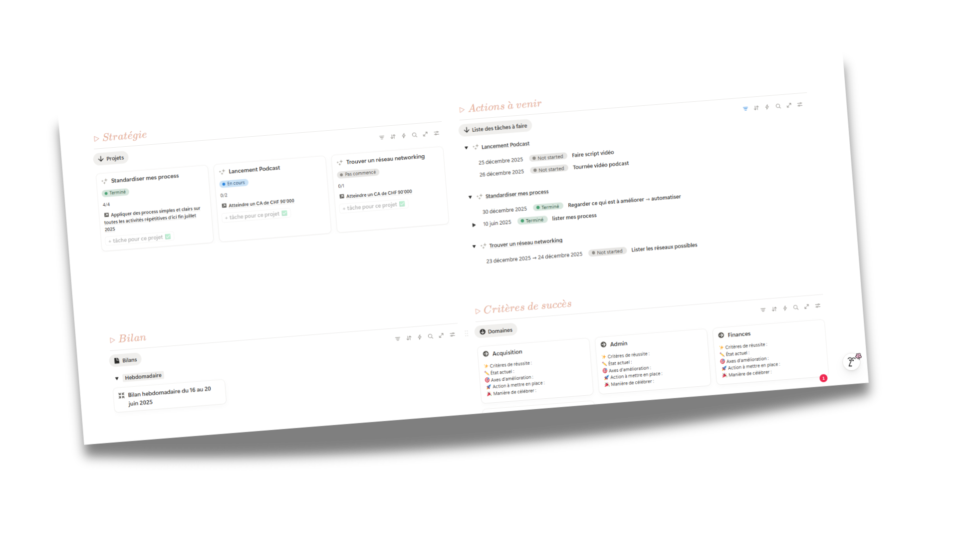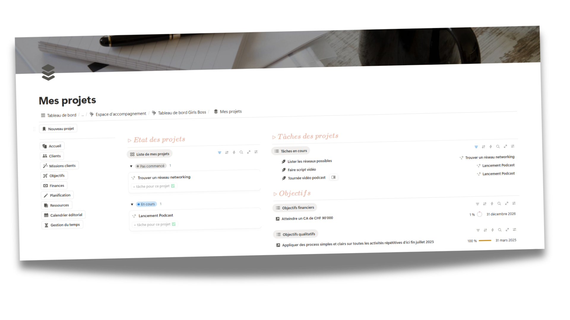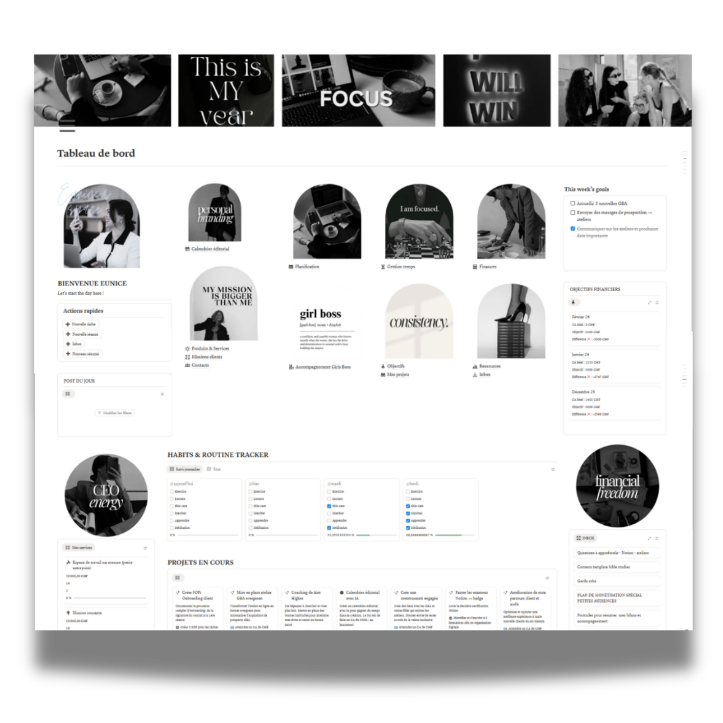 Imagine un seul endroit où tout est relié : tes objectifs, tes projets, tes clients, ton contenu, tes finances...