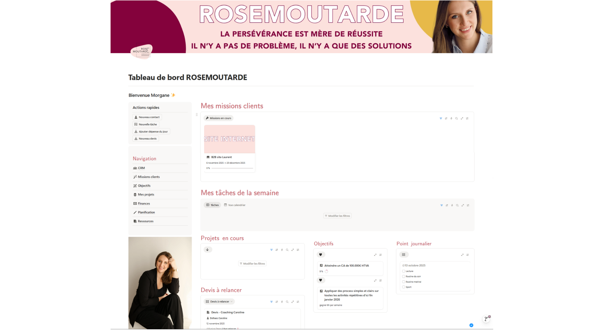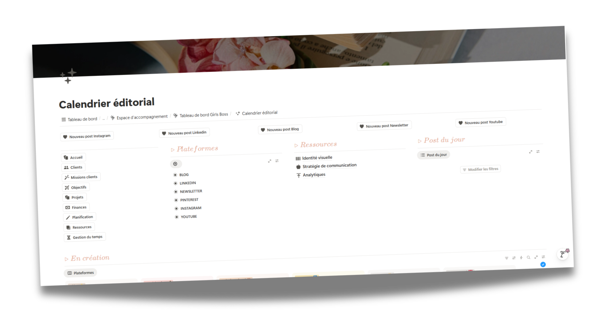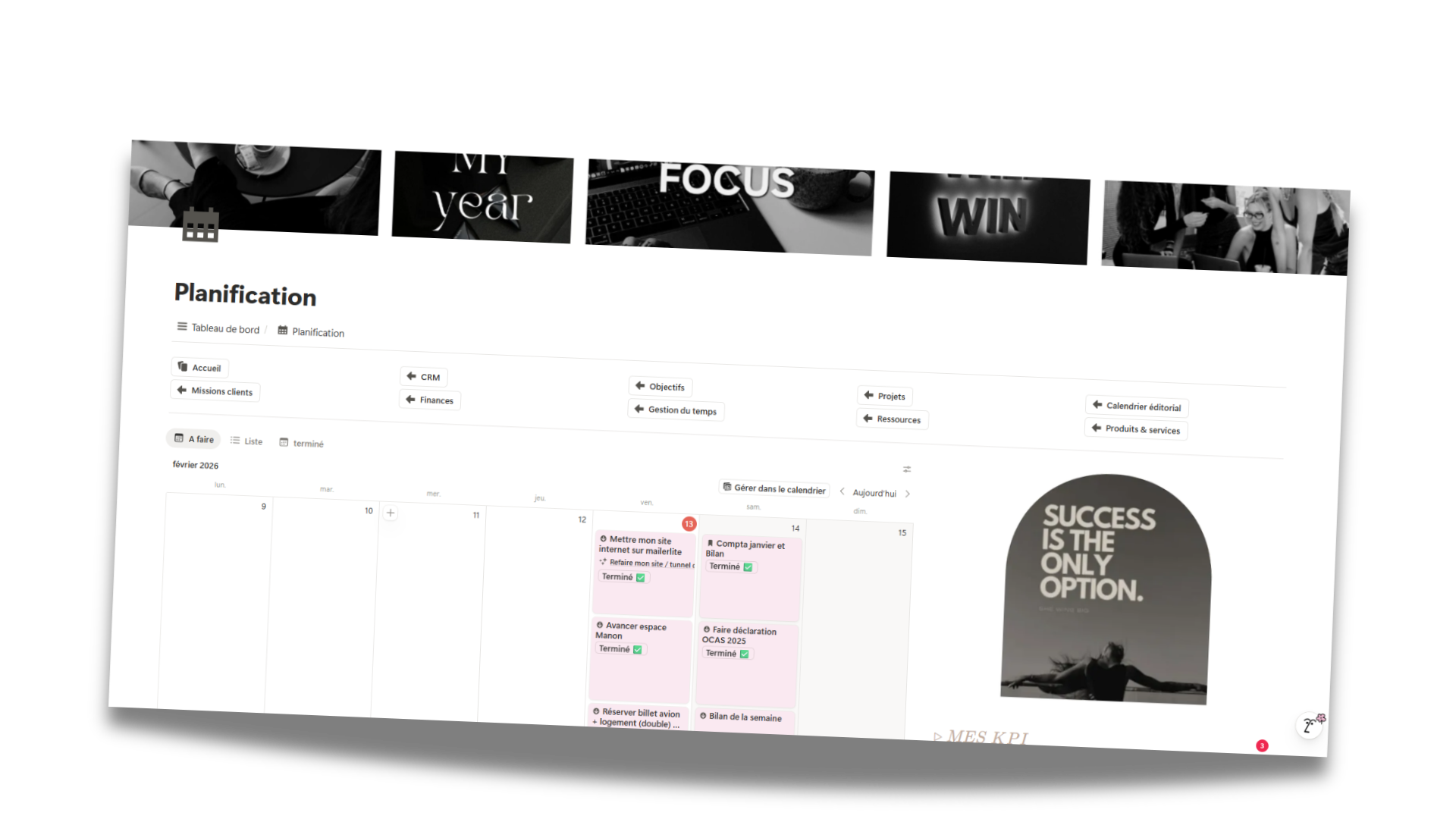 Imagine un seul endroit où tout est relié : tes objectifs, tes projets, tes clients, ton contenu, tes finances...