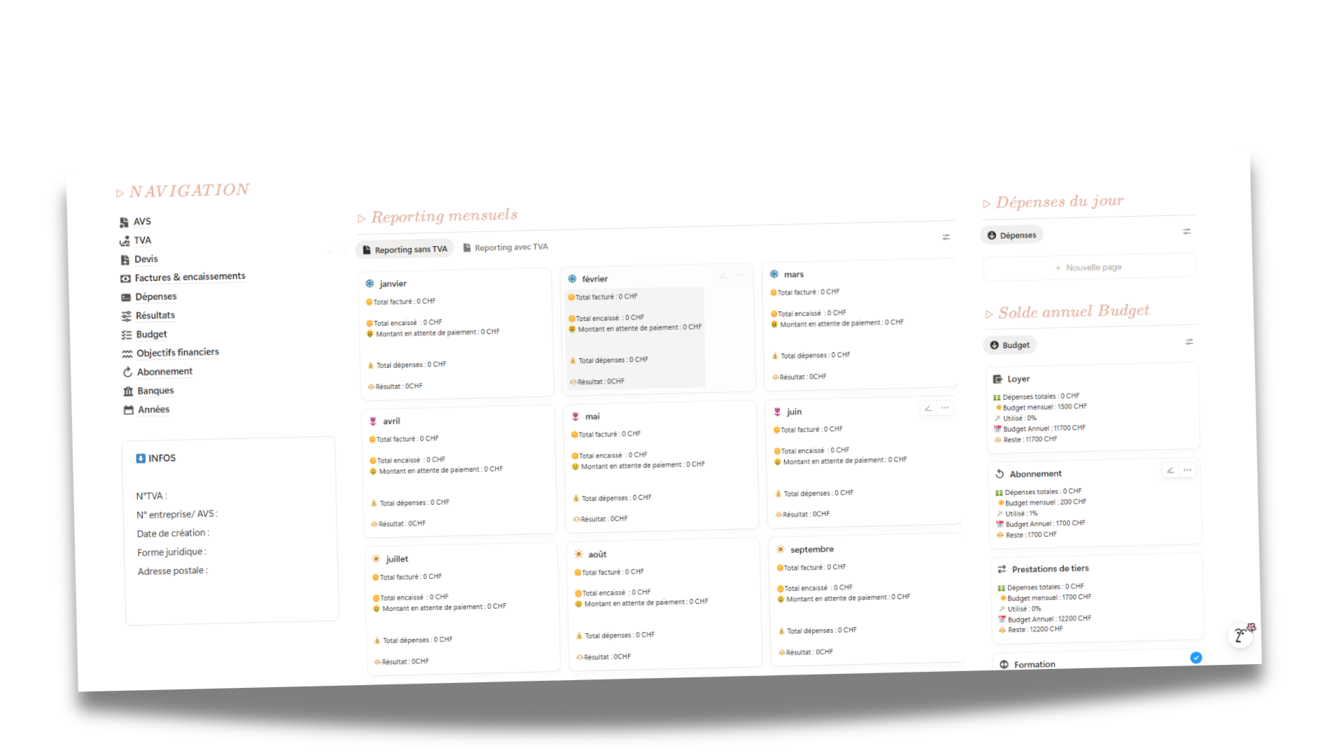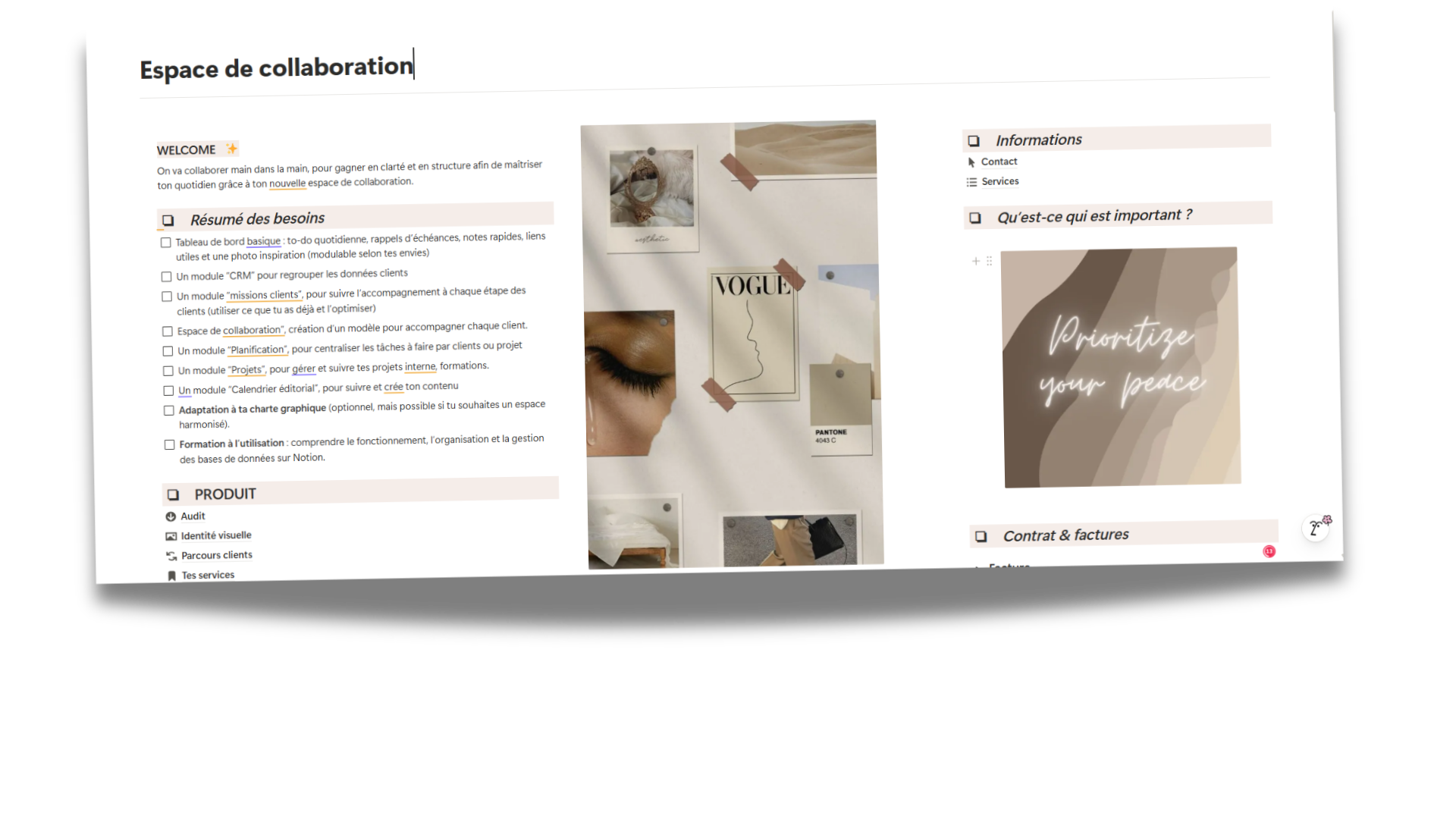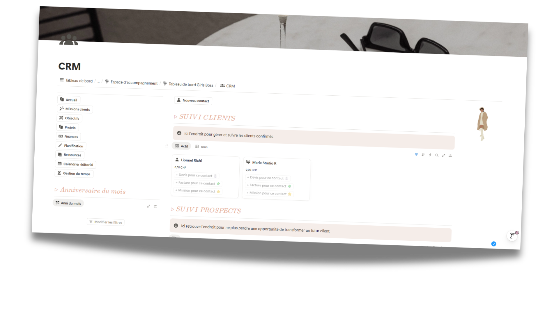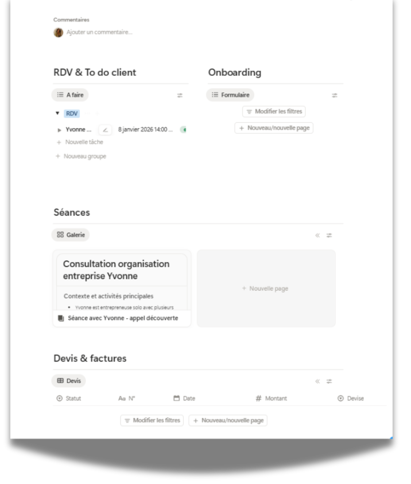 Un espace qui s'adapte à TON business, pas l'inverse. Différentes vues filtrées pour te donner exactement ce dont tu as besoin. Je t'aide à le faire grandir avec toi, sans jamais te limiter dans ta créativité ni te perdre dans la complexité.