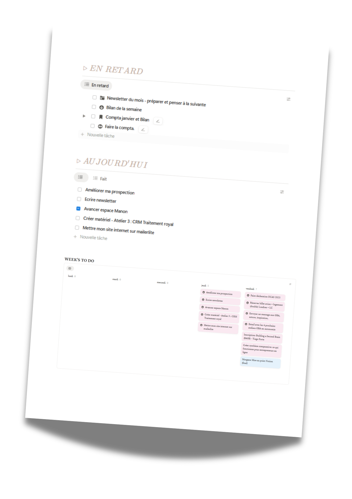 Tu jongle entre 10 outils différents : ton agenda Google, tes listes dans Notes, ton Excel pour suivre tes clients, tes post-it sur le bureau...